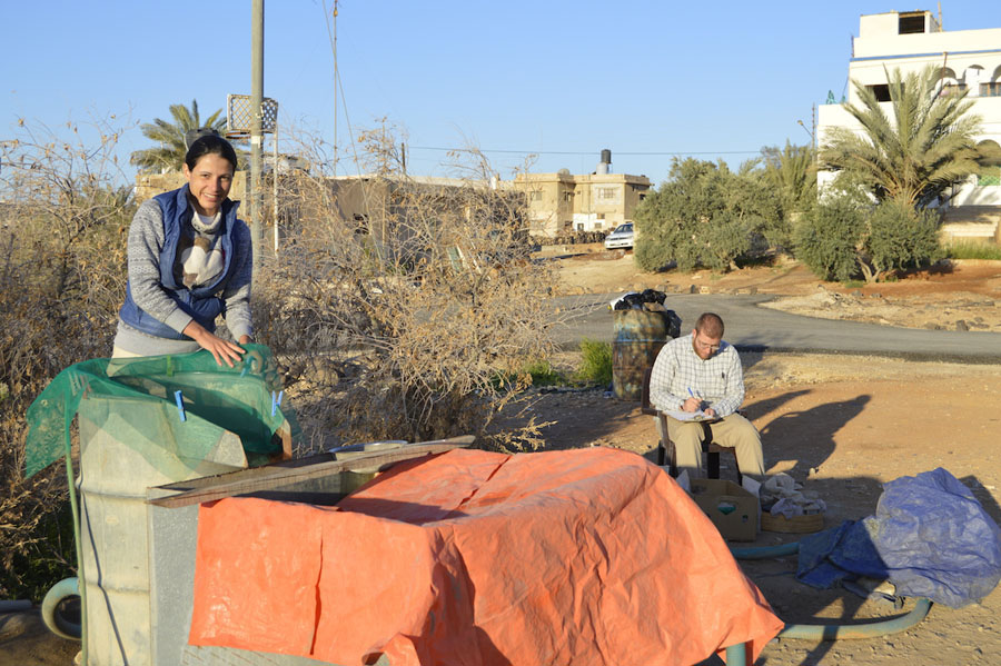 The work in the laboratory essentially picks up where the excavators stop. At Kharaneh IV we collect one hundred per cent of the undisturbed deposits in order recover even the smallest burnt seeds and the tiniest chipped stone debitage. This process, called flotation, involes a barrel tank and gentle flow of water that separates the sediments from the archaeological materials within. Dobrina, our flotation technician, expertly guides charcoal and other delicate botanicals that float through a spout on the rim of the tank into a fine mesh bag below. A coarser flat mesh within the tank catches the materials that sink. The sediments pass through the mesh and settle to the bottom of the tank. The end result is two samples – the flot that contains botanicals and the heavy fraction that contains lithics, bones, shell, and a few unwanted pebbles. Since Jordan is frequently in a state of water shortage, we recycle the overflowing water with a second tank and a pump.